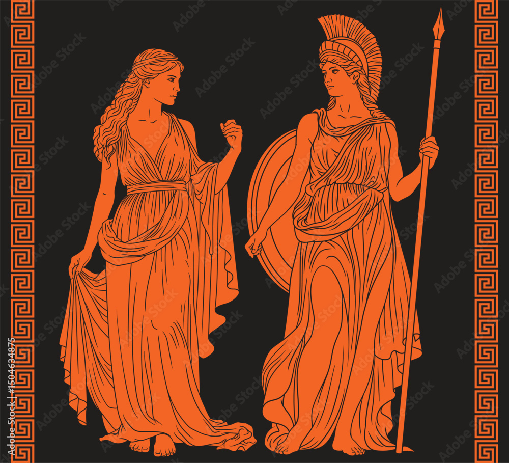 Ταπετσαρία Two ancient Greek women in dress and military armor with a spear stand and talk