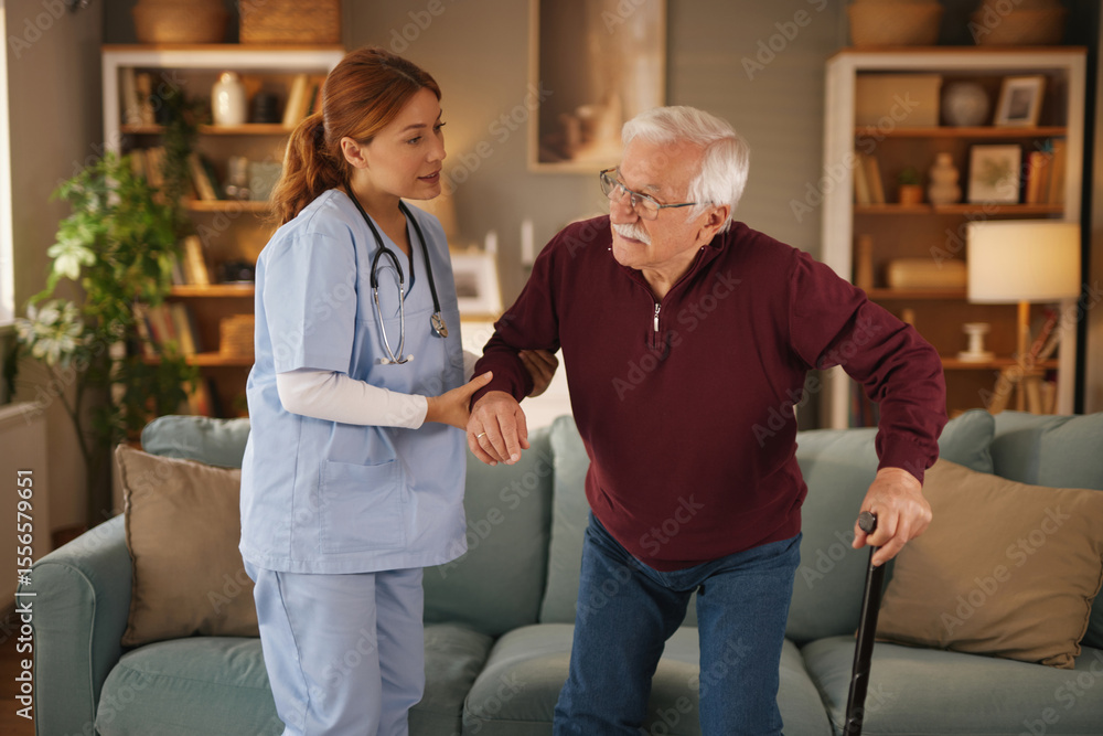 Εκτύπωση καμβά A female home care nurse in scrubs assists an elderly man using a cane to stand up from his couch