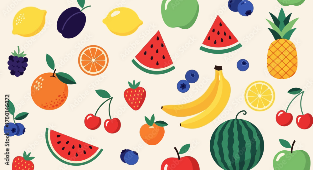 Εκτύπωση καμβά A vibrant and colorful assortment of various fresh fruits, including lemons, watermelons, bananas, oranges, apples, and berries, scattered on a light background