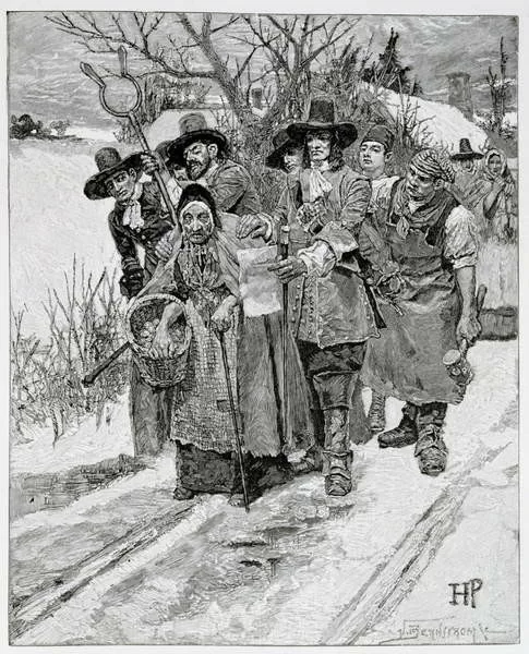 Arresting a Witch, engraved by J. Bernstrom, illustration from 'The Second Generation of Englishmen in America' by Thomas Wentworth Higginson, pub. in Harper's Magazine, 1883