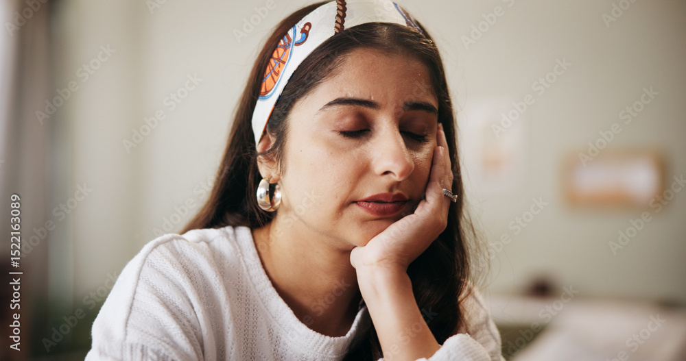 Φωτογραφία Bored, tired and sleepy woman in home with stress, exhausted or rest for laziness