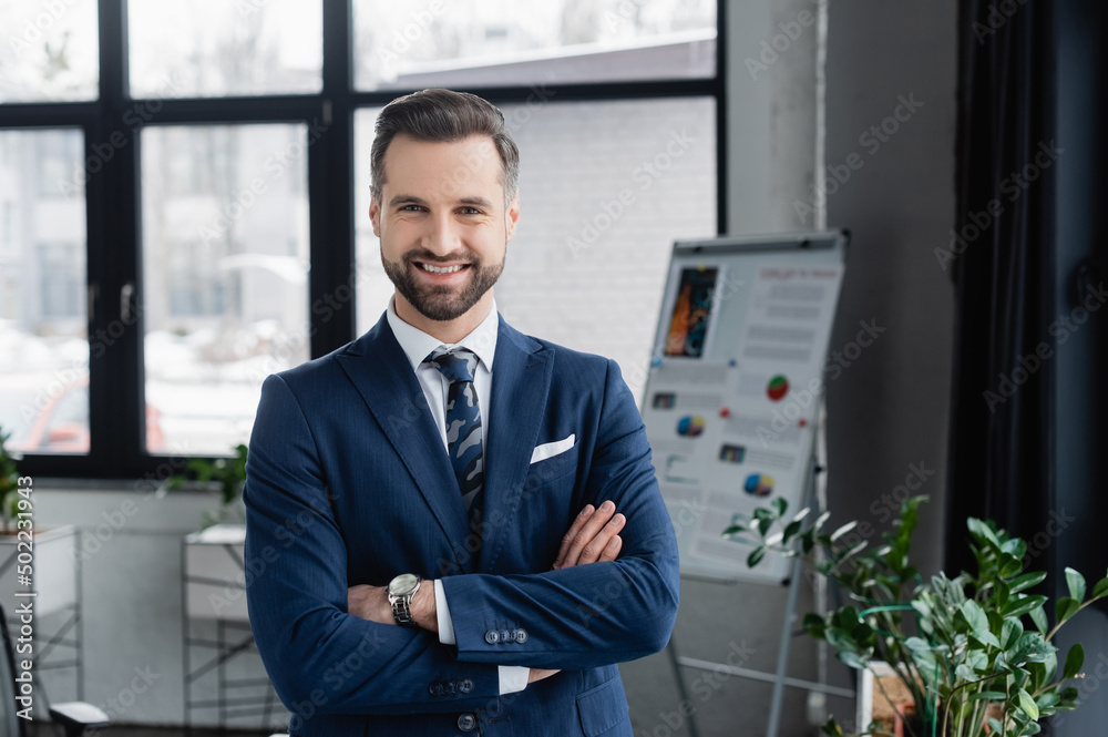 Φωτογραφία happy brunette economist in blazer standing with crossed arms and smiling at camera