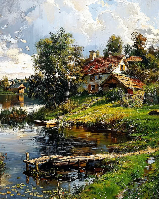 Αυτοκόλλητο _A house on the edge of a winding river, canvas wall decor