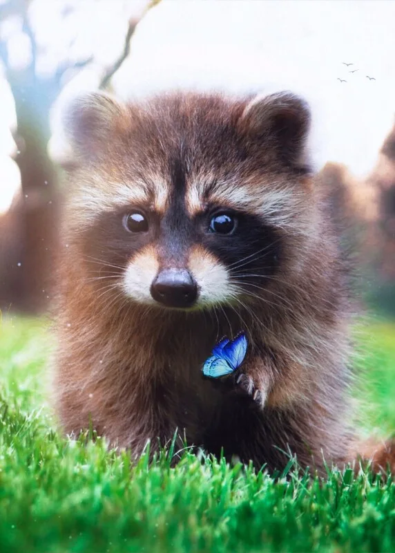 Αυτοκόλλητο Racoon and blue butterfly in green grass