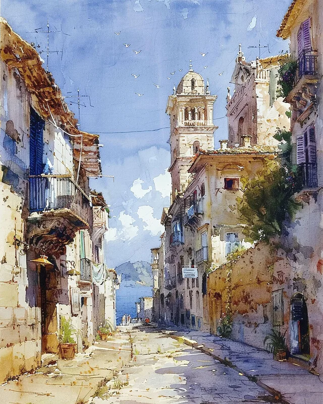Αυτοκόλλητο Watercolor Illustration of White Coastal Houses, wall decor