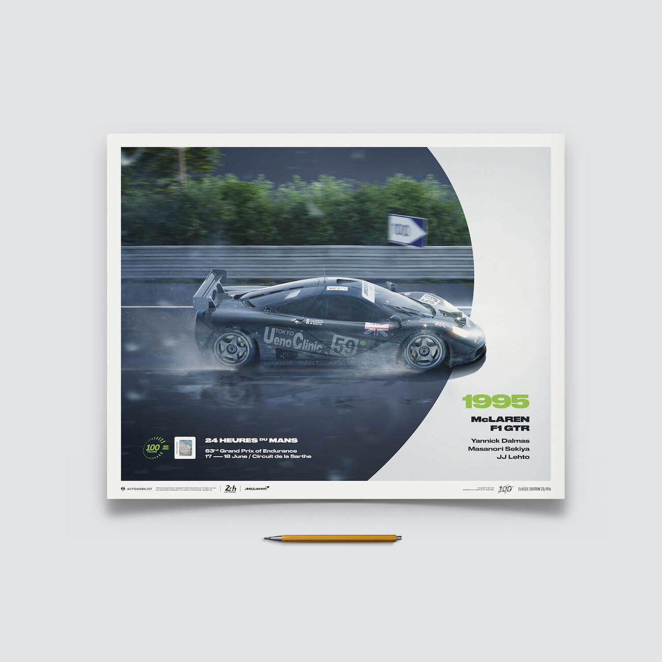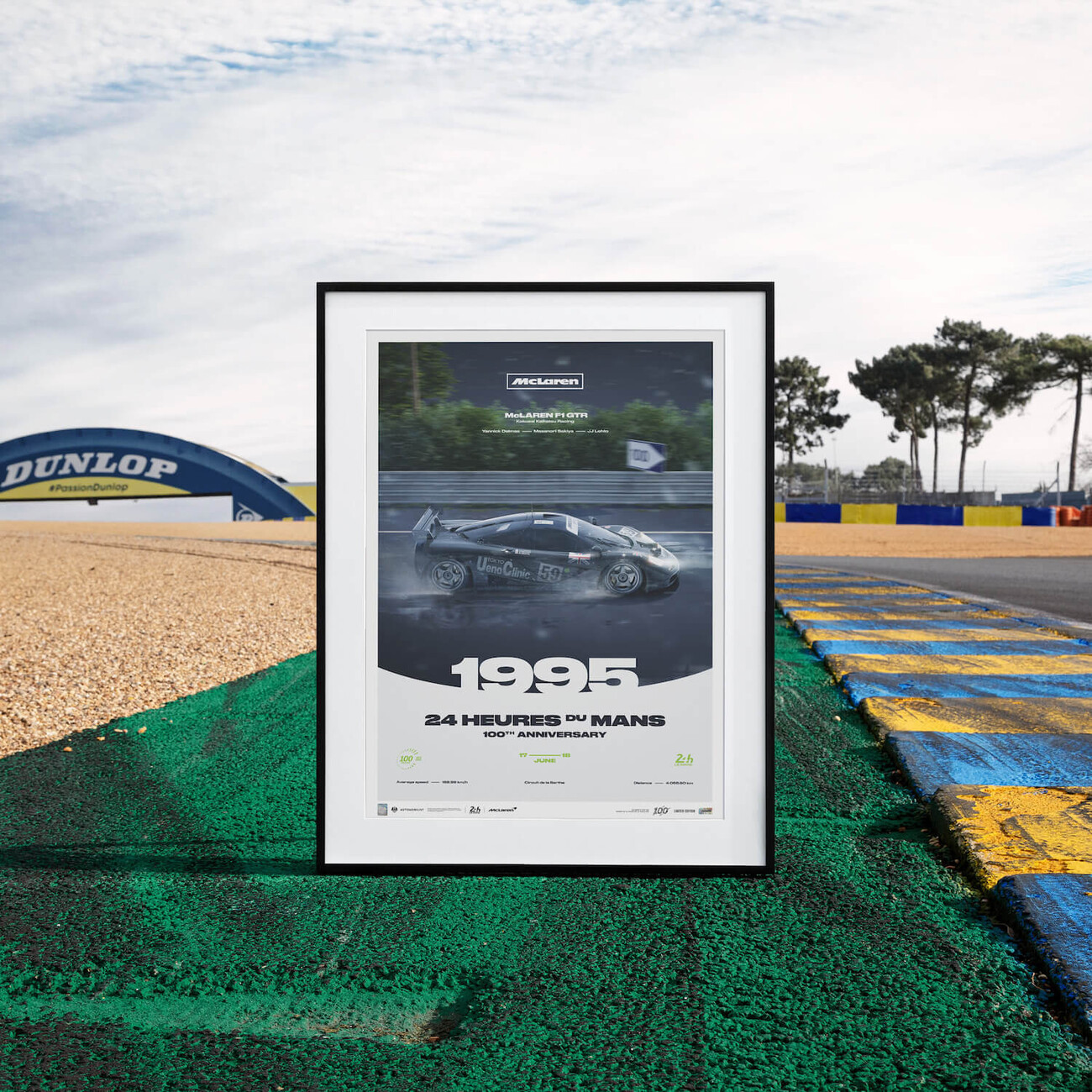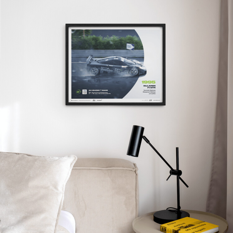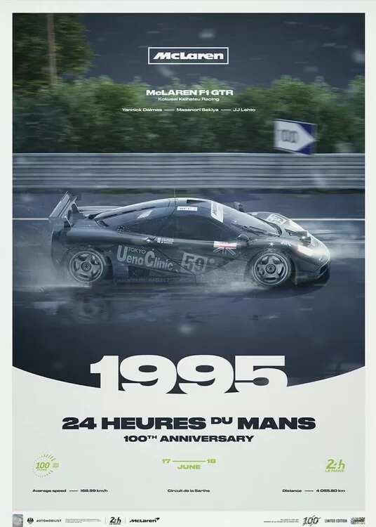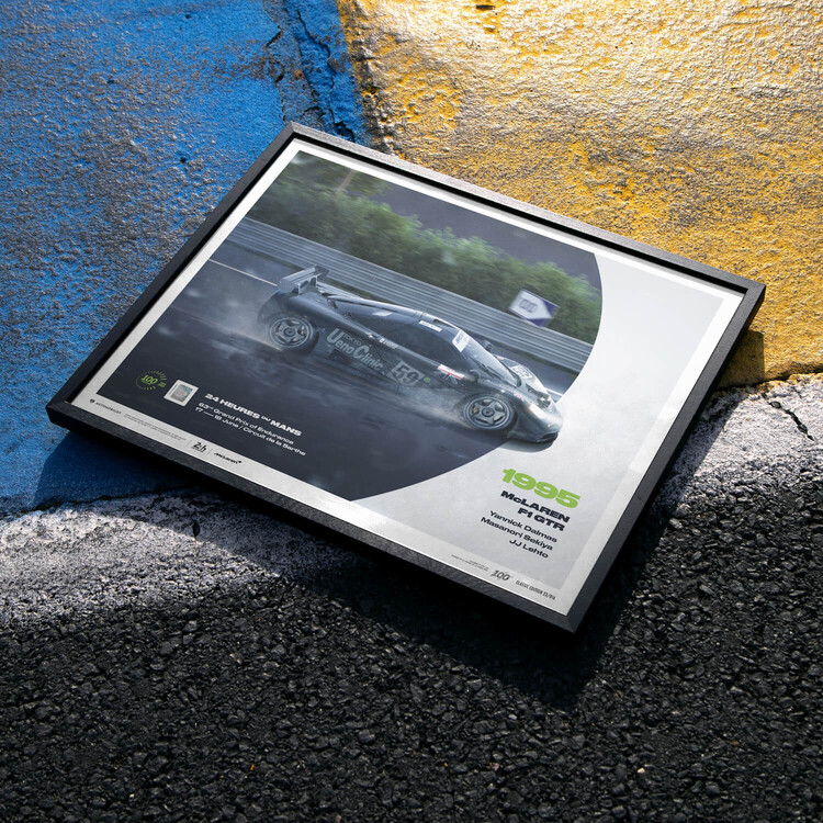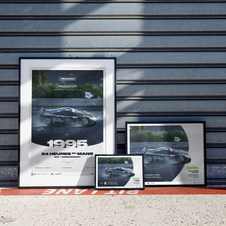 In 1995, McLaren made their debut at Le Mans with the F1, a car designed for grand touring but not endurance racing. Against all odds, the team achieved a remarkable overall victory at the Circuit de la Sarthe, despite being a rookie at the event's track. Joining the roster of our celebratory collection for the Centenary of 24 Hours of Le Mans, we are proud to introduce our new Limited Edition poster, featuring the iconic McLaren F1 GTR.