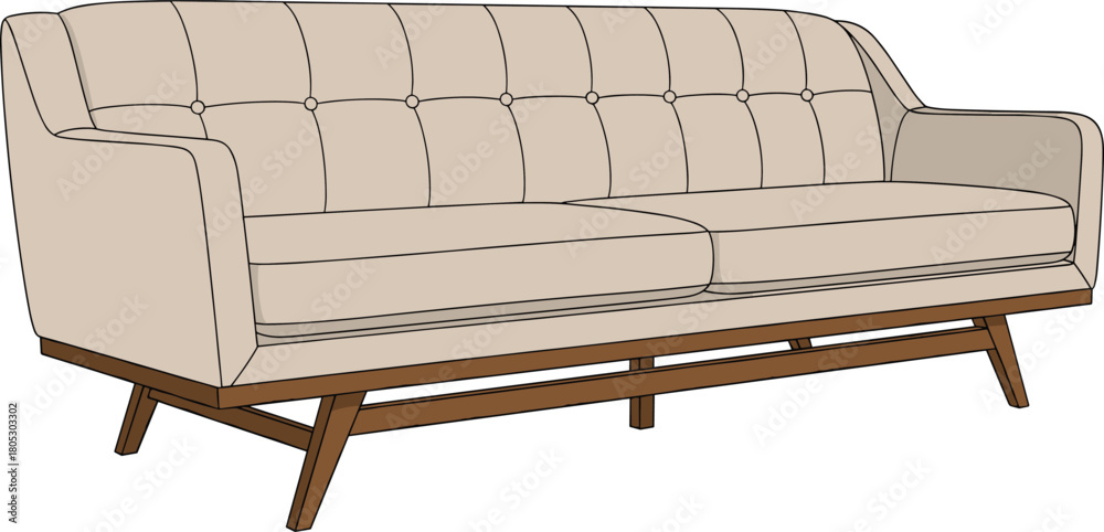 Εκτύπωση καμβά Mid-century modern beige sofa with tufted back and wooden legs flat vector illustration isolated on white background
