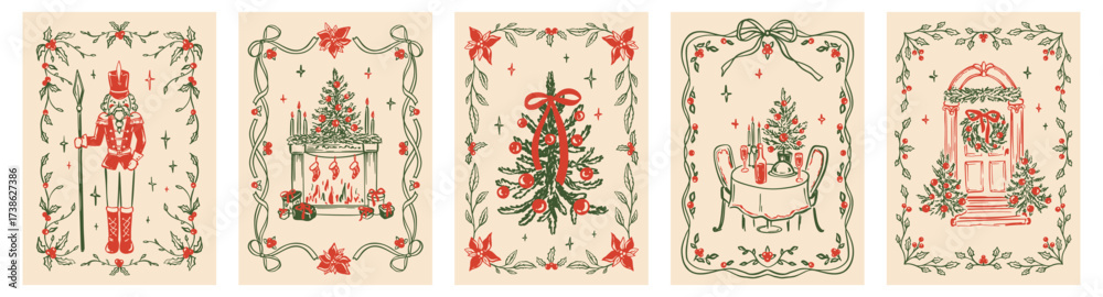 Φωτογραφία Set of hand drawn whimsical red and green Merry Christmas and Happy New Year greeting cards, posters, backgrounds