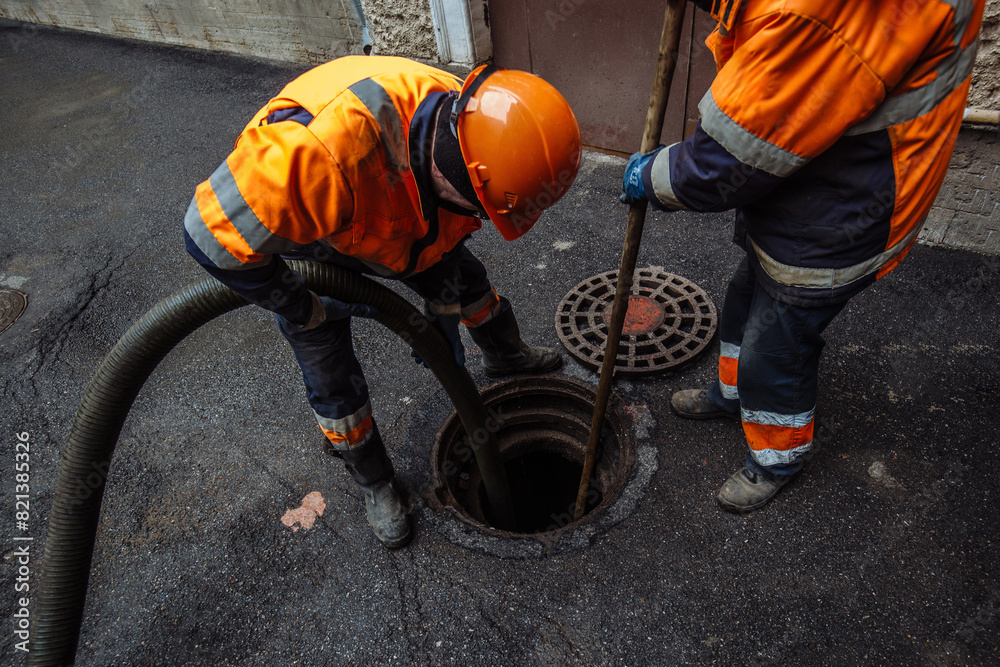 Φωτογραφία Sewer workers cleaning manhole and unblocking sewers the street sidewalk
