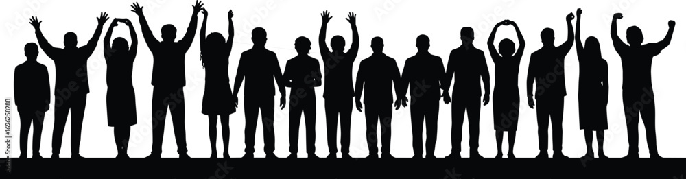 Φωτογραφία Silhouettes of people cheering, group celebration pose, unity concept, standing crowd, team support, happy community, raised hands, togetherness illustration, human figures, crowd silhouette art