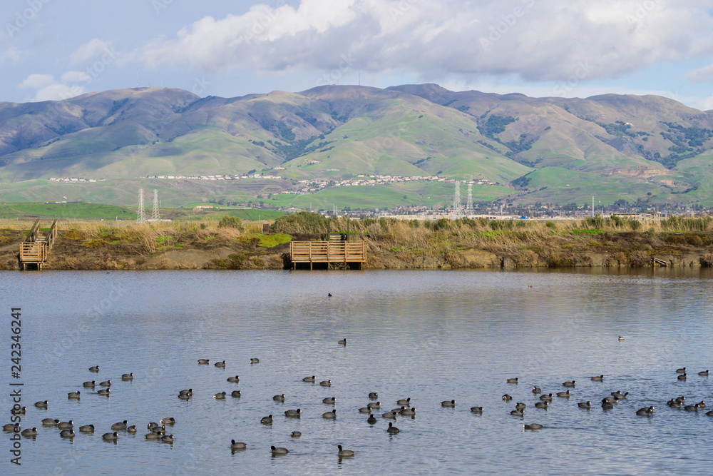 Εκτύπωση καμβά View towards Monument Peak; coots swimming on a salt pond; Don Edwards Wildlife