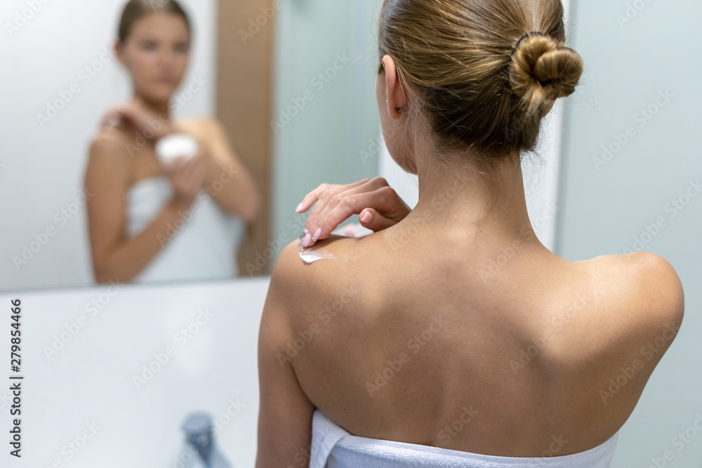 Φωτογραφία Woman applying body cream on shoulder in bathroom